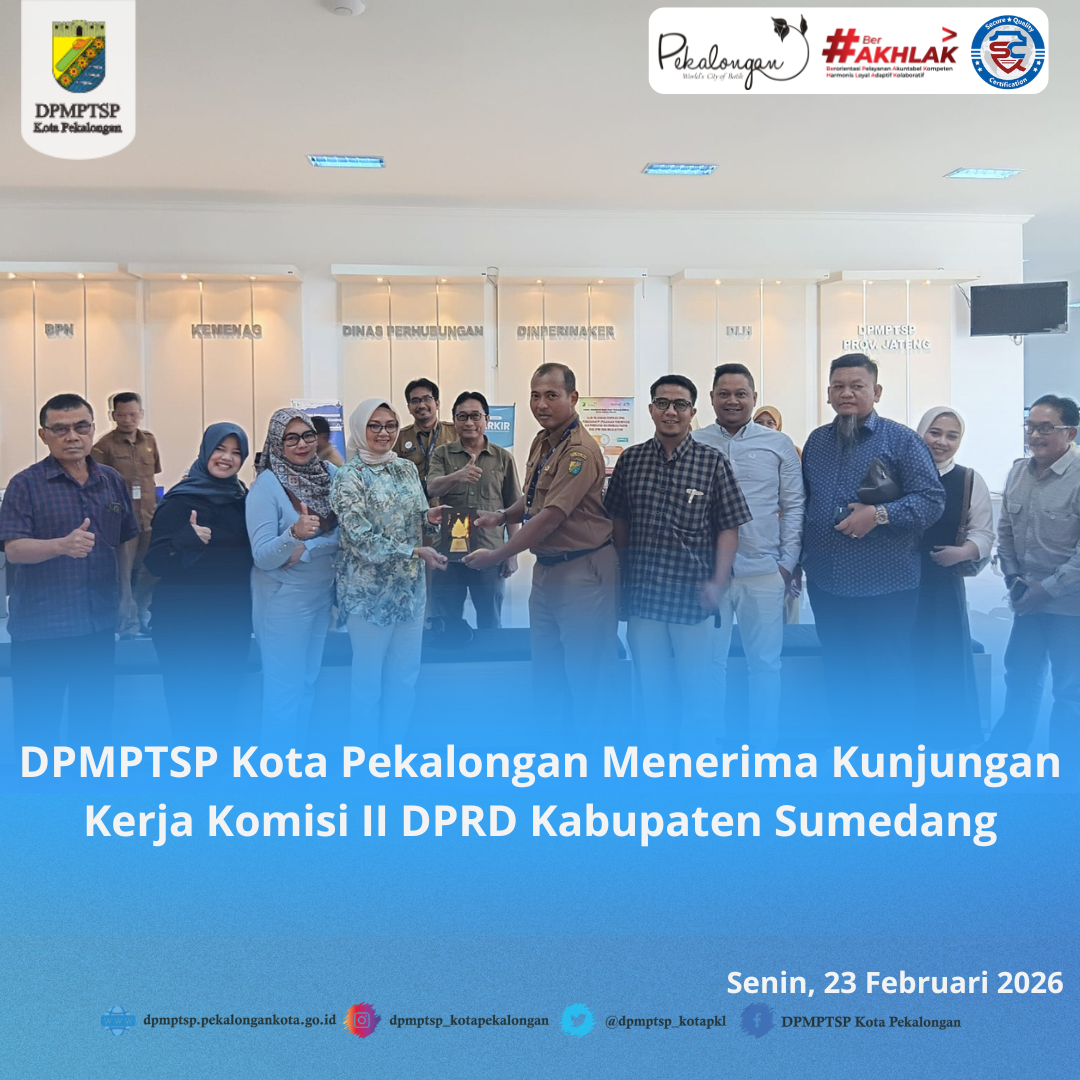 INFORMASI - Pemerintah Kota Pekalongan melalui DPMPTSP menerima kunjungan kerja Komisi II DPRD Kabupaten Kabupaten Sumedang pada Senin (23/2/2026) di Ruang Rapat MPP Kota Pekalongan. Kunjungan ini dilaksanakan dalam rangka studi komparasi terkait kebijakan dan implementasi pelayanan penanaman modal di daerah. Kegiatan dibuka secara resmi oleh Kepala DPMPTSP Kota Pekalongan dengan harapan pertemuan ini menjadi ajang berbagi praktik baik dalam pengelolaan investasi dan pelayanan publik.
