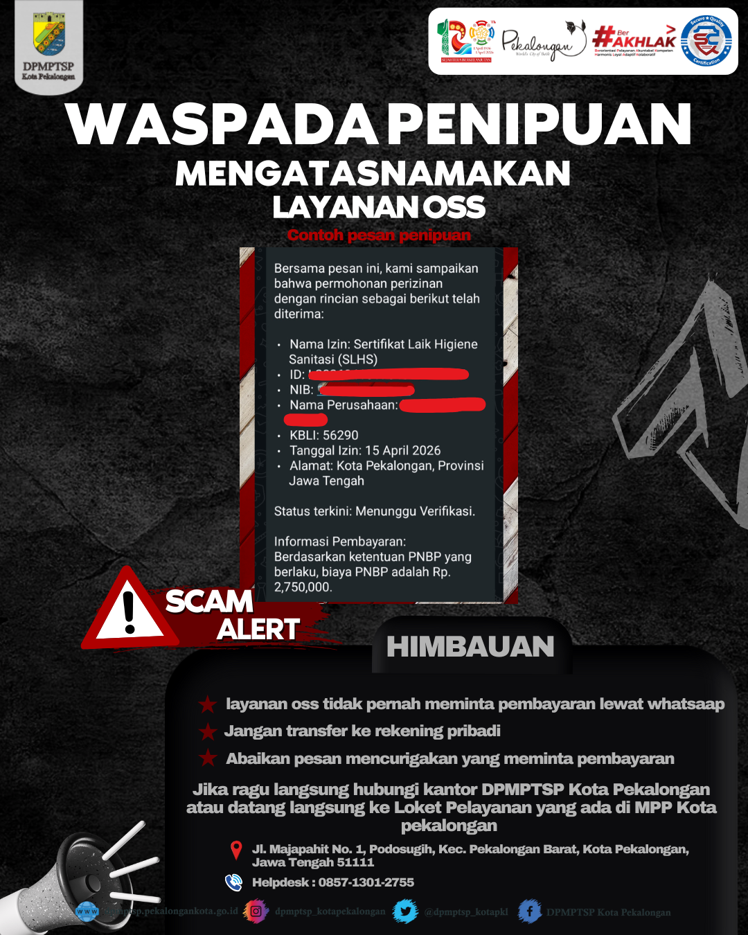 INFORMASI - Masyarakat diimbau untuk berhati-hati terhadap modus penipuan yang mengatasnamakan layanan OSS (Online Single Submission). Pelaku biasanya menghubungi melalui WhatsApp atau media lain dengan dalih proses perizinan, kemudian meminta sejumlah pembayaran ke rekening pribadi. Perlu diketahui bahwa layanan OSS tidak pernah meminta pembayaran secara langsung melalui WhatsApp maupun ke rekening pribadi.