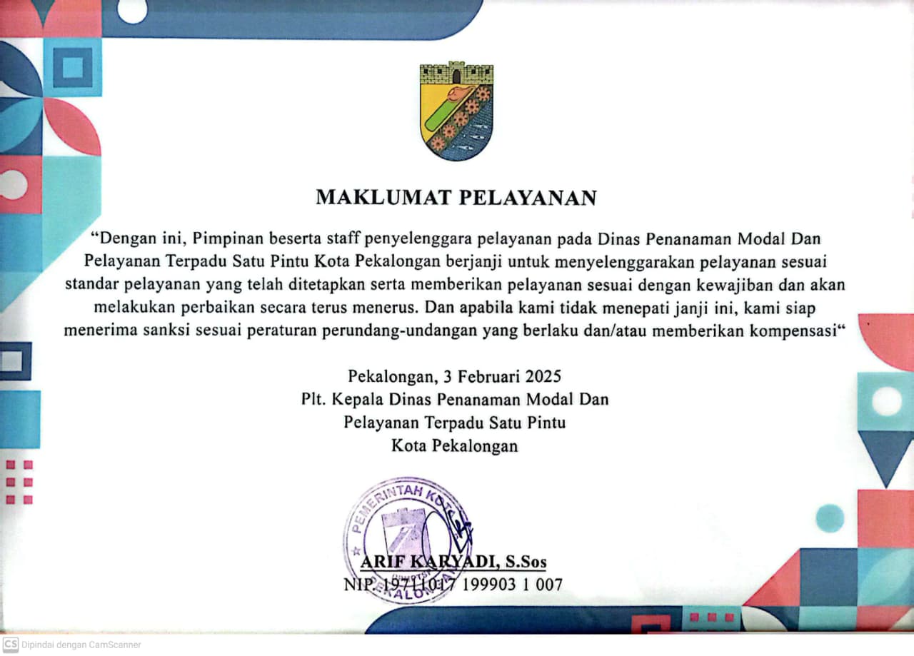 04 September 2025 Untuk Maklumat Perizinan Dapat diunduh disini Maklumat Dinas Penanaman Modal dan Pelayanan Terpadu Satu Pintu (DPMPTSP) Kota Pekalongan