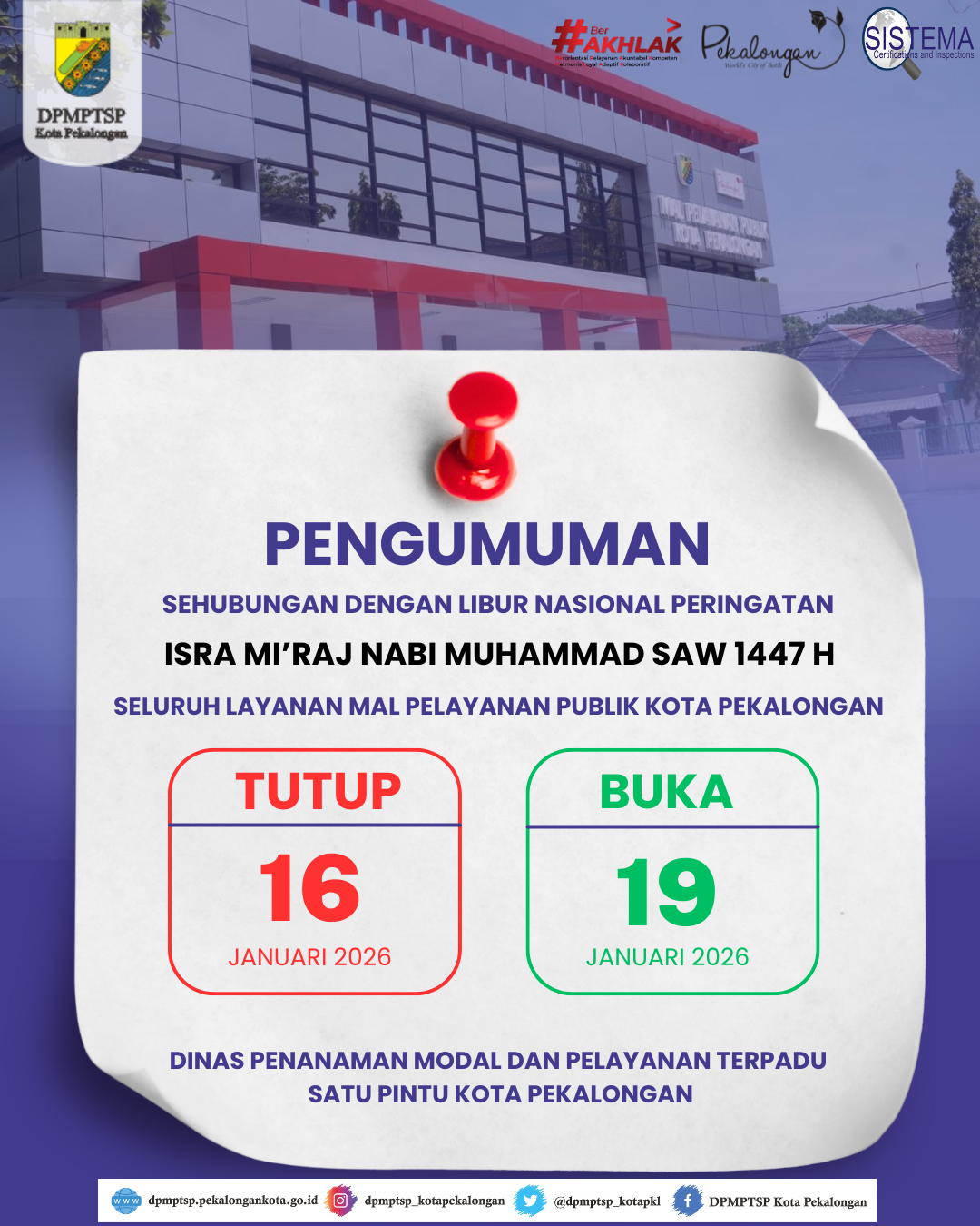 Berdasarkan Surat Edaran Sekretaris Daerah Kota Pekalongan Nomor B/439/800.1.6.2/2025 tanggal 30 Desember 2025 tentang Hari Libur Nasional dan Cuti Bersama Tahun 2026, serta dalam rangka Peringatan Isra Mi’raj Nabi Muhammad SAW 1447 H, dengan ini kami sampaikan bahwa pelayanan di Mall Pelayanan Publik (MPP) Kota Pekalongan: